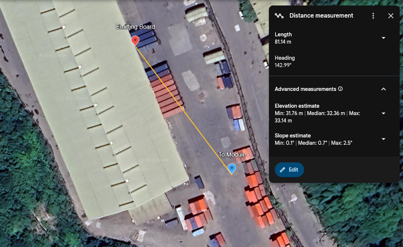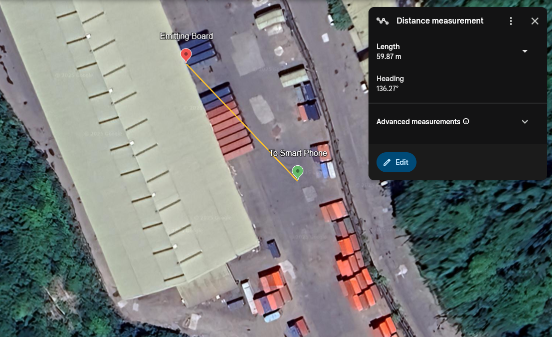 - 訊號嚴重受限: 與開放場域的測試結果相比,1M模式連線距離從數百米急劇降至數十米。這證實了多個金屬貨櫃群對 2.4 GHz 藍牙訊號造成極端衰減效應。