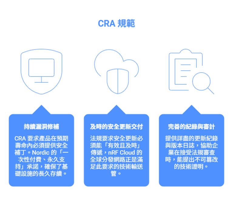 - 及時的安全更新交付: 法規要求安全更新必須能「有效且及時」傳遞,nRF Cloud 的全球分發網路正是滿足此要求的技術輸送管。