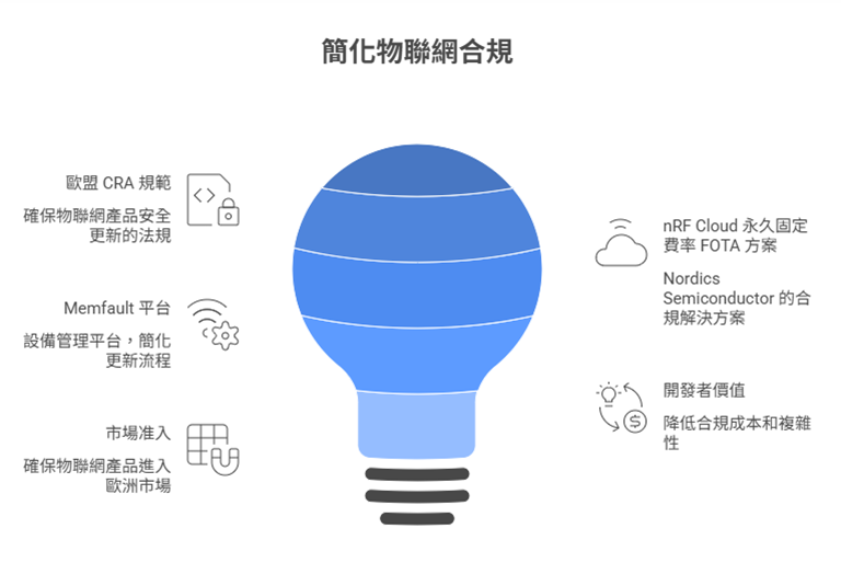 隨著歐盟《網路韌性法案》(Cyber Resilience Act, CRA)預計於 2027 年全面強制執行,物聯網(IoT)產品能否在其生命週期內提供「安全更新」,已成為進入歐洲市場的准入護照。為了簡化開發者的合規路徑,Nordic Semiconductor 與設備管理平台 Memfault 合作,推出了全新的 nRF Cloud 永久固定費率 FOTA 方案。此服務將原本複雜且昂貴的雲端更新,轉化為一種簡單、低負擔的配套組件。