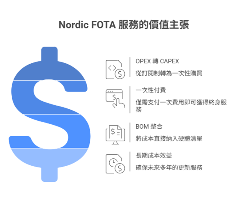 Nordic 方案改採「買斷」模式,大量部署時每台裝置僅需 約 $1 USD。這意味著您在產品出貨時付一次錢,未來數年的更新服務就已經「付清」了。
